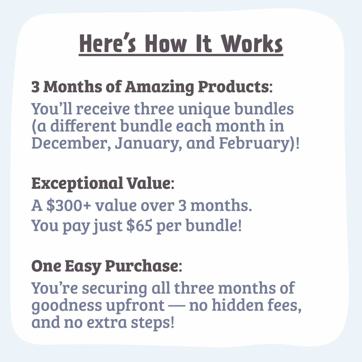 Don’t miss out! To enjoy all three months of this specially curated bundle, be sure to place your order by 12/16. Secure yours today and start the year off with delicious snacks!