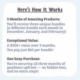 This special bundle is designed as a three-month subscription to give you the full experience of new and exciting flavors and products each month. It’s the best way to enjoy maximum value and variety!