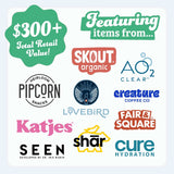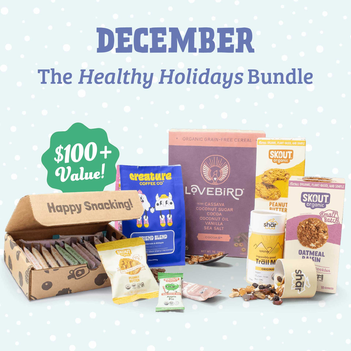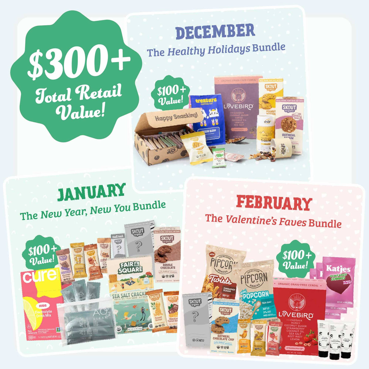 You’ll receive three unique bundles (a new bundle each month from December - February) filled with snacks from Skout Organic, as well as premium products and exclusive coupons from brands we love.