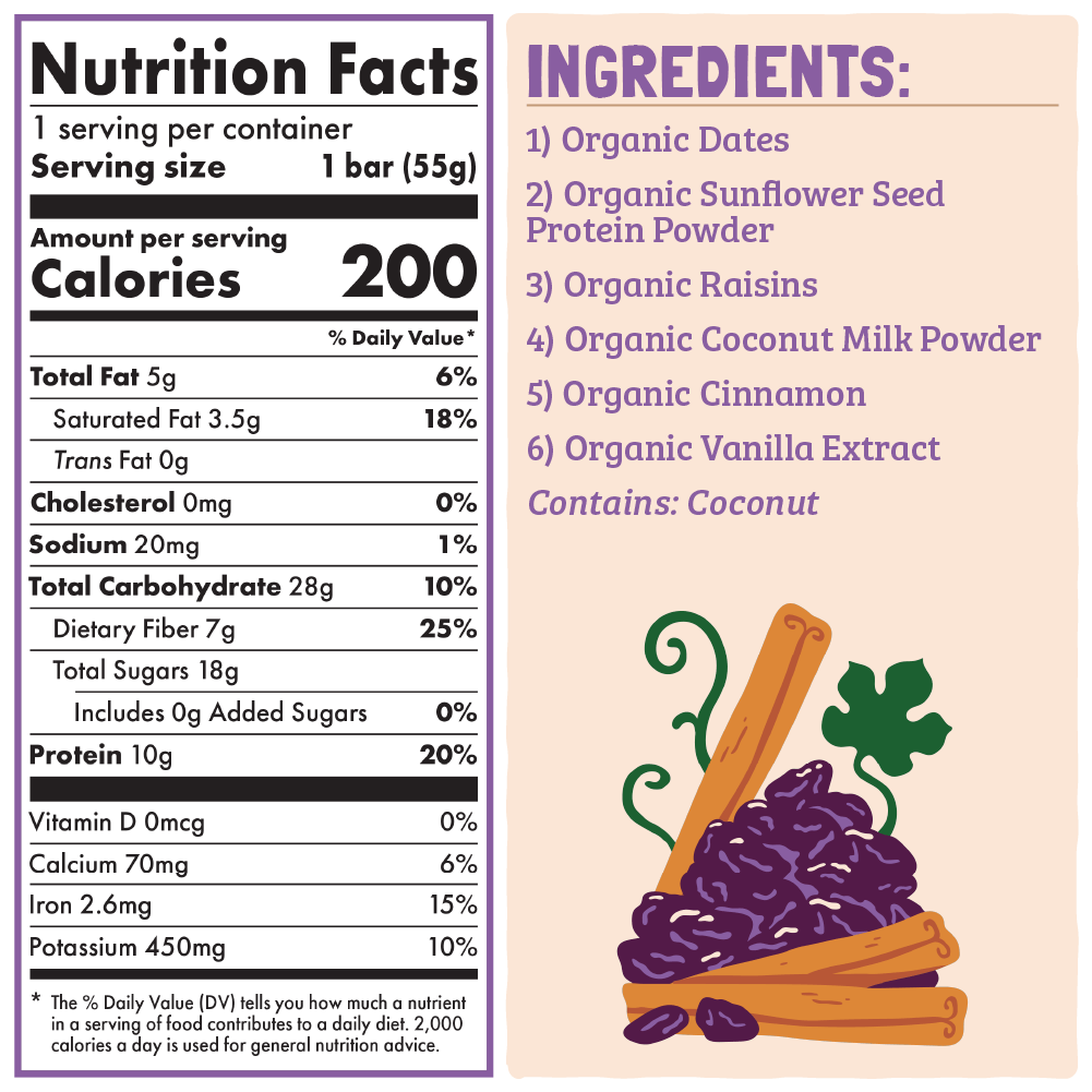 The taste of gooey fresh baked cinnamon rolls is wrapped up in our newest Small-Batch Protein Bar. Bursting with sweet raisins, a touch of cinnamon, and 10 grams of plant-based protein for a confectionery satisfaction of flavor, you won’t believe there are only 6 organic ingredients. You’re gonna want to pack these for breakfast, snack, and dessert!